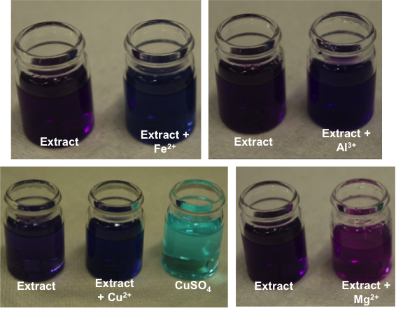 In each trial, a teaspoon (ca. 5-6 g) of the desired metal salt was dissolved in 100-150 mL of water to make a series of stock solutions. 5-6 drops of each stock solution were then added to anthocyanin mixtures extracted from plant material in water (ca. 5 mL). The solution was swirled for a few seconds and the resulting colours were observed (examples are illustrated in figure 4). A set of results that use red cabbage as a source of anthocyanins is presented here as an example, the supporting information outlines the anthocyanin extraction procedure.