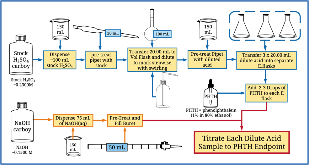 After completing these exercises, the students are tasked with analyzing a sulfuric acid solution where the concentration of the sulfuric acid solution is too high to be conveniently analyzed with the standardized sodium hydroxide solution available to them. To complete the task, students must first quantitatively dilute the stock sulfuric acid solution which illustrates a practical use for the quantitative transfer and solution preparation techniques from previous exercises. The students then quantitatively transfer aliquots of the diluted acid solution to Erlenmeyer flasks and titrate the diluted acid solutions with the sodium hydroxide solutions to a phenolphthalein (PHTH) endpoint. A flowchart illustrating the procedure is shown in Figure 2.