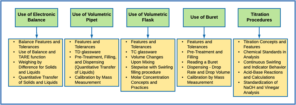 Taken together, the early exercises with individual pieces of equipment, the two basic titration activities, and the two capstone titration exercises have been effective in helping students gain the necessary familiarity with quantitative laboratory procedures that they can maximally benefit from later experiments (see Figure 5). The constant revisiting of the core techniques allows students ample time to learn the fundamentals of each technique as well as begin to view them modularly since different core skills may be employed for nominally similar experiments.