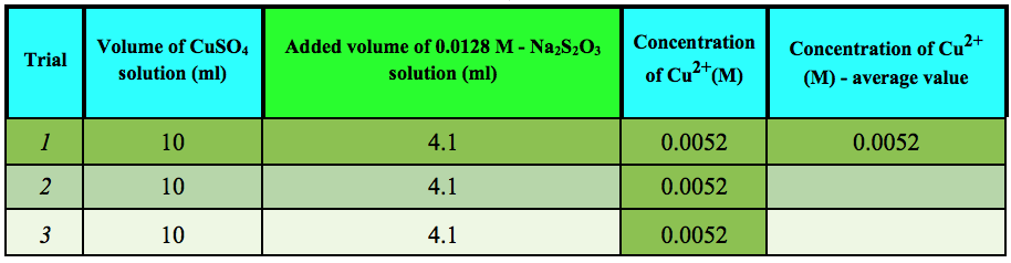 We notice that we are titrating the iodine generated in Reaction 3; moreover, the stoichiometric ratio between the thiosulphate ions and the copper (II) ions is 1:1. Final results are in the table below: