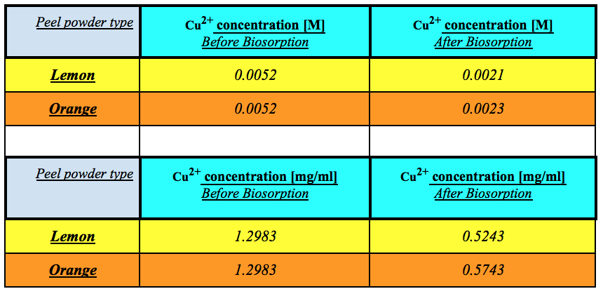 In the table down below I reported the concentration of copper before and after the biosorption process (concentrations are in mol/L and mg/ml):