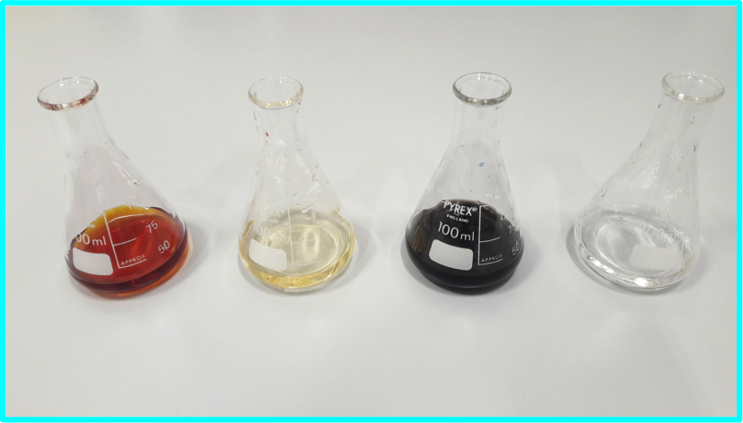 Figure 2: from left to right: 1.) Solutions of KIO3 after the addition of KI and HCl. 2.) Solution immediately before the endpoint. 3.) Solution after the addition of starch. 4.) And of titration (color intensity depends on the amounts of chemicals used).