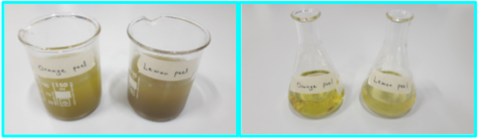 The final step is the addition of the lemon and orange peel powder into two different standardized solutions of copper II sulphate. In 50 ml of each solution, I added 1 g of each powder and I stirred the mixture overnight; that is followed by a filtration step in order to clear up the mixture. Another iodometric titration allows us to figure out the effect of the peels on the solution tested. Of course, the addition of the lemon powder gives rise to a cloudy suspension and a slight change of color could happen as well. Although a good filtration clears up the liquid (see Figure 3), tiny particles can pass through the filter (that especially happened for the lemon peel powder solution which looks cloudy even after filtration).