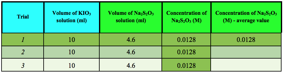 In Table 1 are reported the results I got (concentration of KIO3 standard solution is 9.8130 x 10-4 M):