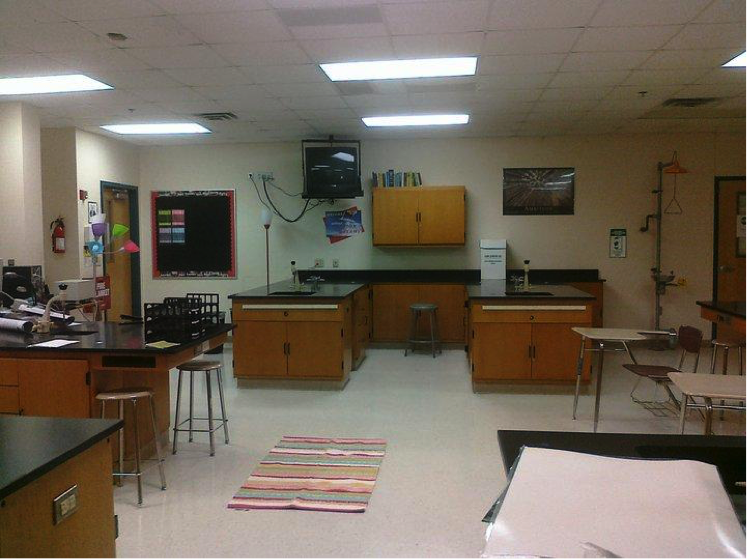 Figure 2A - A view from my teacher’s desk in the U.S. from 8 years ago. There is a desktop computer and a document camera. Lab stations line the perimeter. No windows in this lab.