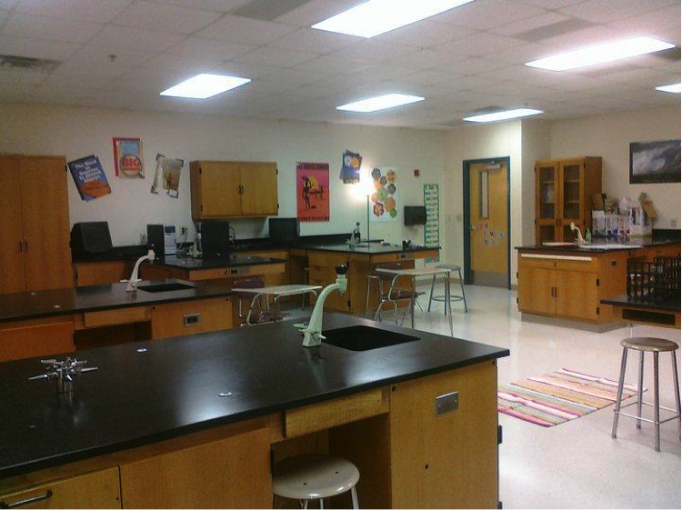 Figure 2B - A classroom/lab. Notice only two regular desks. The students sit at the lab benches for both lab and lecture. No document camera in this lab.