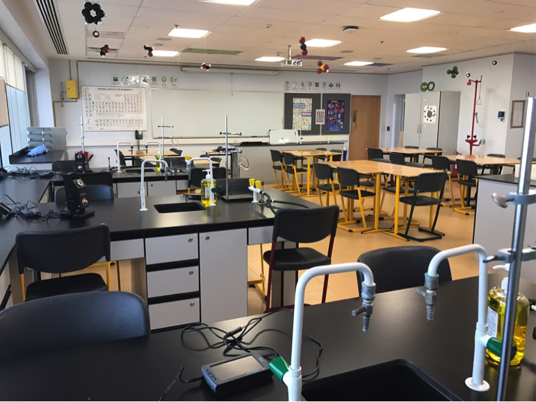 Figure 1D - A classroom/lab. You can see a lot of Vernier equipment in this lab. Windows line the wall to the left. You see no desktop computers because every teacher has a laptop. This is also a one-to-one school. Students use their laptops daily in labs and lectures.