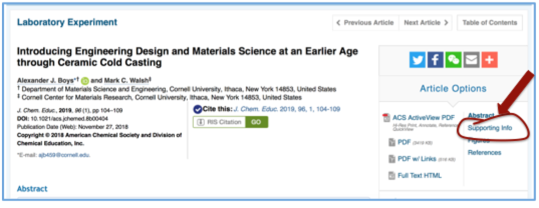 To bring this into a classroom, I’m set with most of the materials, but the cookie cutters pose a problem. Each small group needs 3 identical star-shaped cutters as molds. Students could test different shapes, depending what I could find at a thrift store or borrow. Or, my cupboards hold options like silicone cupcake molds, jar lids, or silicone candy molds (bacon-shaped, anyone?). The authors also offer suggestions in their article based on teacher testing feedback, such as premeasuring Plaster of Paris for students, so I'll incorporate that. I’d also prefer the middle school groups to estimate the cost of water and plaster using local numbers, rather than those offered by the authors. How to integrate these changes? Look for Supporting Info (see graphic below). After clicking on the link, the article offers four separate files in both PDF and Word formats, making it easy to adjust the details, while retaining the overall lab.