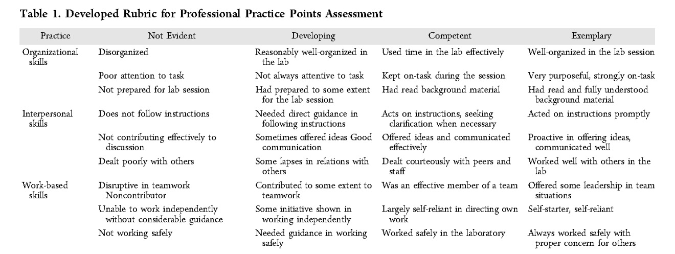 Aspects of this could be integrated into the high school chemistry lab and classroom and are likely already in use by high school educators already. Students could be brought in to a discussion, as the undergraduates were, as to what specific behaviors would signal meeting a particular level of competence. Select just a few skills to start. For example, discuss how it looks if one “used time in the lab effectively” or “was an effective member of a team” or “worked safely.” Ask them to make direct connections to how these skills would be a plus at their jobs, volunteer positions, or in other classes. Use five-minute self-assessment opportunities at the end of lab to gauge how their view of their skills matches up with yours. Are you already integrating skills like these into your lab or classroom? Share!