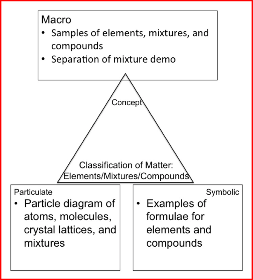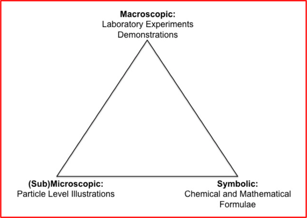 The triangle is well known amongst reseachers in chemical education but not so much by teachers. Peter Mahaffy of Toronto made it a tetrahedron but these are diffiult to draw with words attached. The fourth part was the human aspect. Here in this blog I call it relevance, http://microchemuk.weebly.com/2-blog-is-this-supposed-to-happen .