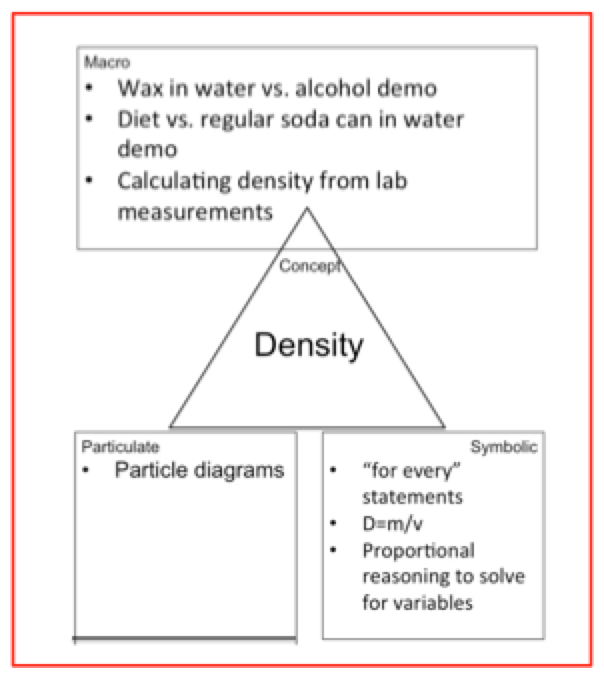After seven years of using Modeling InstructionTM, I feel I’m pretty good at predicting and addressing common misconceptions because the same types of misconceptions appear every year. This past summer our conversations turned to, “How can we improve our instruction to try and prevent the initial misunderstanding?” We had all read Dorothy Gabel’s article Improving Teaching and Learning Through Chemistry Education Research: A Look to the Future1 and were intrigued by the author’s description of the three-fold system of representing concepts in Chemistry. Figure 1 below summarizes the three types of representations.
