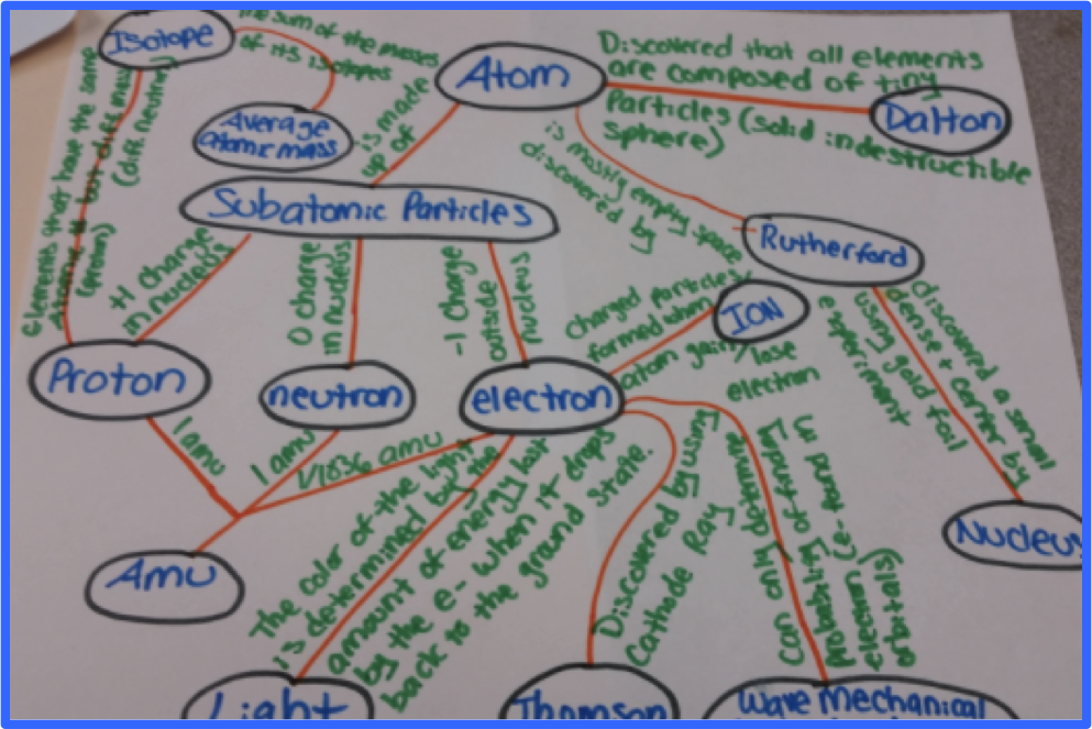 At this station students are provided a word splash. They then need to create a concept map showing relationships between key terms. Students can complete their map on a white board or poster paper. Students are asked to first write all the vocabulary words out on post-it notes and place them near ideas they think are connected. Students then link the words together by writing sentences or phrases. Once all words are on post-its and organized on the poster or board the post-its are removed and a final map is created using markers. See Figure 6.