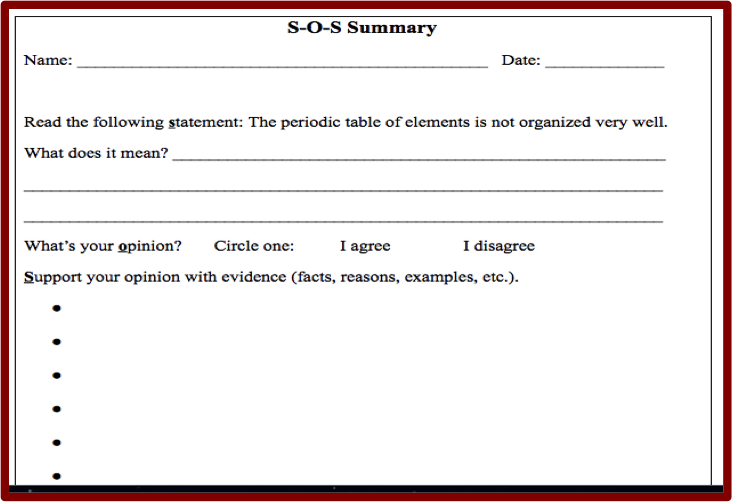 SOS stands for Statement, Opinion, Support. This Text-Set option requires the teacher to prepare a debatable statement from the assigned article. Students then circle whether they agree or disagree and support their choice with evidence from the article. This is similar to the CER (Claim, Evidence, Reasoning) for laboratory investigations. Figure 5B provides an example for a unit covering the periodic table.