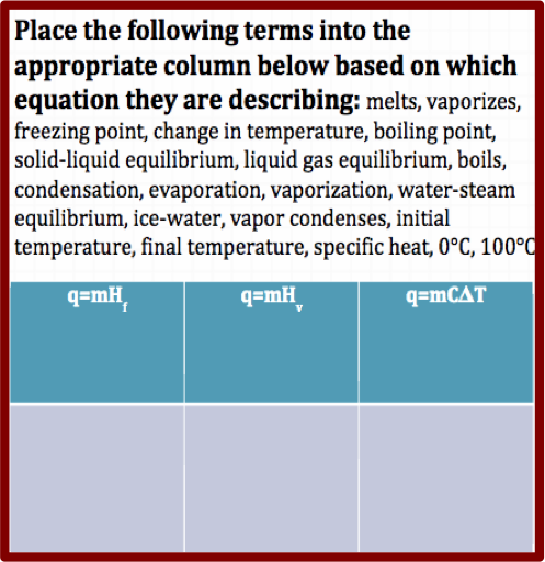 The scaffolding station breaks down the mathematical calculations in a unit by first isolating what types of vocabulary terms students will see in conjunction with certain equations (see Figure 3A). For example, when learning about various heat equations, students might struggle to identify which of the following heat equations should be used; heat of fusion, heat of vaporization or specific heat. In the first part of the scaffold, students identify which key words are associated with each specific equation. Once students have gained a thorough understanding of which equation to use in different situations they are given a question using one of the equations that is scaffolded with support questions to help solve the problem. The example in Figure 3B is a “heat of fusion” question with prompts.