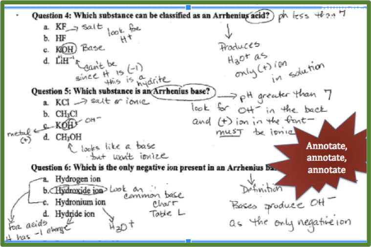 The annotation station (Figure 4A) requires students to read the question and then write everything they are thinking about the question. Student can annotate the question as well as the answer choice, and should write any knowledge they think will assist them in answering the question or notes that would be helpful if they were trying to explain the correct answer to a friend. This allows the teacher to formatively assess student understanding. It also allows misconceptions to be explicitly identified when false conceptions are presented.