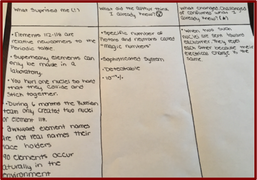 In this station students read an article or some anchoring text. I typically require students to complete this station to ensure all students are reading about some real-life application or extension of the curriculum. Students have often been asked to read articles and summarize them in other courses. I avoid using that strategy because my students have not shown enthusiasm for completing that common assignment. Instead, I present four other options and they like these alternatives. One is the creation of a three column chart where they write: “What surprised me”, What did the author think I already knew” and “What changed, challenged or confronted what I already knew”. The example in Figure 5A is one created from a ChemMatters article (Brownlee, 2009).