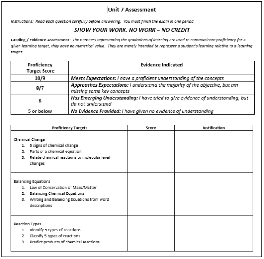 In addition, with guidance from the teacher, students can develop self-assessment skills by grading their own exams. Students begin the remediation process by reflecting on their own work while grading their exams. One critical aspect of this assessment method being done successfully is allowing students opportunities after the exam to correct mistakes. This can be done through test corrections or retakes. By having exams broken up into sections and learning goals, students can be given the opportunity to retake portions of exams instead of retaking the exam as a whole. Using proficiency scales to grade each section of the exam can be extremely beneficial to students as they reflect on whether they are proficient or still developing their knowledge in a given area.