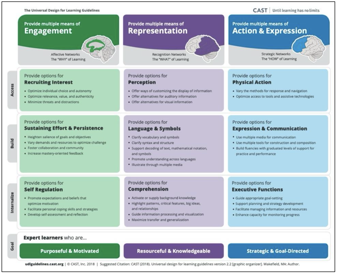 - CAST (2018). Universal Design for Learning Guidelines version 2.2. Retrieved from http://udlguidelines.cast.org