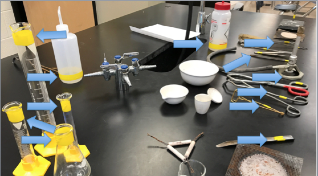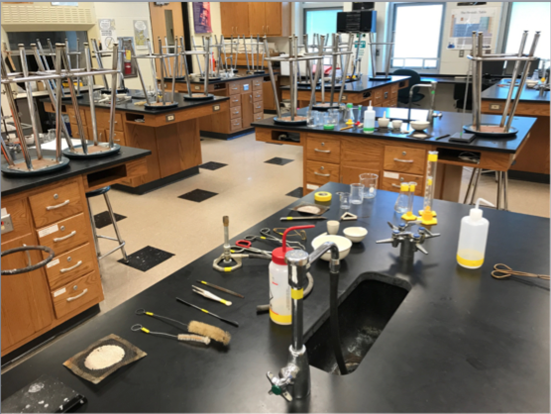 Now, I am sure I am not alone when I say it is frustrating when you have your students ready to start the lab and you have lab groups that are missing certain pieces of lab equipment from their lab drawers. When your time in lab is limited to the time you have in class, then every minute is important. So I decided to take the time and to do some needed inventory. I wanted to match equipment to its designated table. Next, I wanted to make sure that each of my eight lab tables had the proper equipment needed to eliminate no more missing equipment. Sure enough, as I began the inventory project, I had several tables missing equipment, so once everything was laid out and counted and organized then I had to make sure it was going to stay that way. I had several rolls of colored tape and it was easy to then begin marking each of the pieces of equipment and glassware with tape. Now a word of caution, don’t tape anything that will be directly heated. As an example, the clay triangle and the crucible should not be taped. However, the tops of beakers, graduated cylinders, and Erlenmeyer flasks, the bottom of Bunsen burners, and ring stands can all be marked. Next, I placed a small piece of tape around the center faucet to designate the matching equipment to that table. Also, I’m not concerned with the tape coming off as the equipment gets washed. Overall, it didn’t really take that much time to tape everything once it was all set out. On the plus side, by doing the inventory, I hope to move from four person lab groups to two person lab groups. With four person lab groups, I was starting to see an increase in observers and a decrease in workers which led me to wonder how much learning was taking place in the lab. This is just my attempt to trying to keep things better organized in my lab which in return will help with safety as less students will have to move around the lab searching for equipment. How do you keep your studnets laboratory equipment organized? If you have any other questions or further suggestions then please feel free to share. Thanks again to Steve Sogo for the idea.