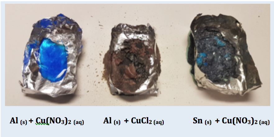 To carry out the reaction, a small aluminium boat is constructed from a square piece of foil (about 5 cm2). Dry copper nitrate powder (about 1 g, quantities don’t need to be exact) is added on top. A few drops (approx. 5 or 6) of water is then dripped from a plastic pipette in order to wet the powder. No reaction is observed, even after waiting one or two minutes (Figure 1, left). The experiment is repeated using copper chloride instead of copper nitrate. Almost immediately, the aluminium foil breaks apart, releasing a gas (fizzing) and water vapor into the air (Figure 2, center)! The reaction is very exothermic and sudden. A red/brownish ppt. (copper metal) is left behind:1