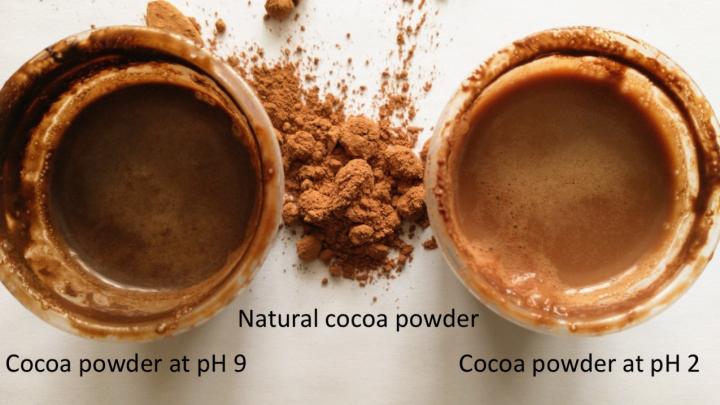 Incidentally, cocoa powder is often treated with a base to give a more rich and dark brown color, improve the flavor, and enhance its solubility in a process known as "Dutching." Natural cocoa powder is very light brown, and it gets darker brown as the pH increases (Figure 3). Under certain conditions, strongly alkalized cocoa powder can even turn black.2