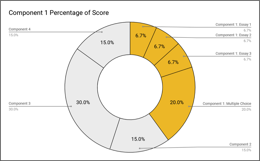 Component 1 of National Board Certification is a computer-based assessment testing content and pedagogical knowledge related to an area of expertise. It includes three essays weighted at 6.67% each and a multiple-choice section weighted at 20% of the overall National Board score. Component 1 (highlighted in yellow in Figure 1) is the largest percentage of the total National Board score at 40% as it is one of two performance-based tasks. An area of expertise in Chemistry, Biology, Physics, or Earth and Space Science will be the focus of your assessment. While questions will be answered from all areas of science, more in-depth questions will be asked in the area of expertise.