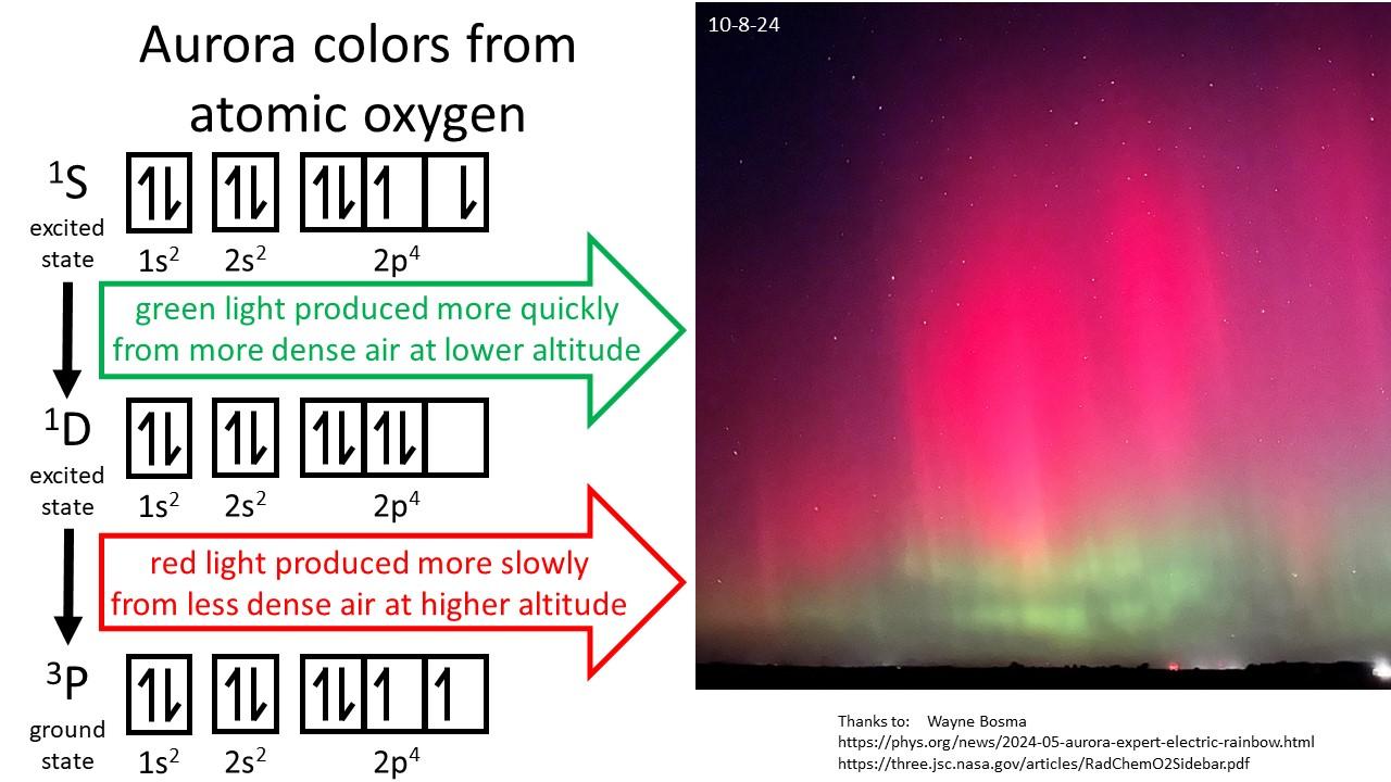 An excellent resource for both learning about and also tracking the aurora is the Aurora Dashboard (Experimental) and associated webpages hosted by the National Oceanic and Atmospheric Administration Space Weather Prediction Center.6 Aurora are formed when particles produced by the Sun, e.g., from outbursts such as coronal mass ejections, reach the Earth’s magnetosphere. Electrons can be knocked out of the Earth’s magnetosphere and channeled towards the poles. These electrons strike nitrogen and oxygen-based species in the upper atmosphere, causing them to produce visible light. The air becomes denser as altitude decreases, and the collisions producing the glow in the atmosphere do not reach the surface of the earth. A very common color associated with the aurora is green. Another, somewhat less common color, is red. Both colors are produced by excited oxygen atoms, which are much more common in the upper atmosphere than near the Earth’s surface where molecular oxygen dominates. The electronic states associated with this light production are described in Figure 1. This figure shows an image of a PowerPoint slide that I showed to my General Chemistry 1 course and my Environmental Chemistry courses. The left side describes the orbital diagrams for oxygen atom electrons in the ground and two excited states. The right side shows a picture of aurora recently viewed from near Peoria, IL. An electron striking an oxygen atom can excite its electrons from the ground state (a triplet state with the term symbol 3P) to an excited state such as a singlet state. Both the ground and excited states shown in Figure 1 all have the electron configuration 1s22s22p4, however, the excited states have unusual electron arrangements. In the 1S singlet electron arrangement, one of the unpaired spins is “spin down”, as opposed to the typical “spin up” for a ground state unpaired spin.7 In the 1D singlet electron arrangement, the four electrons in the 2p orbitals are all in two pairs, rather than having two paired and two unpaired electrons like the 3P ground state or the 1S excited state.7