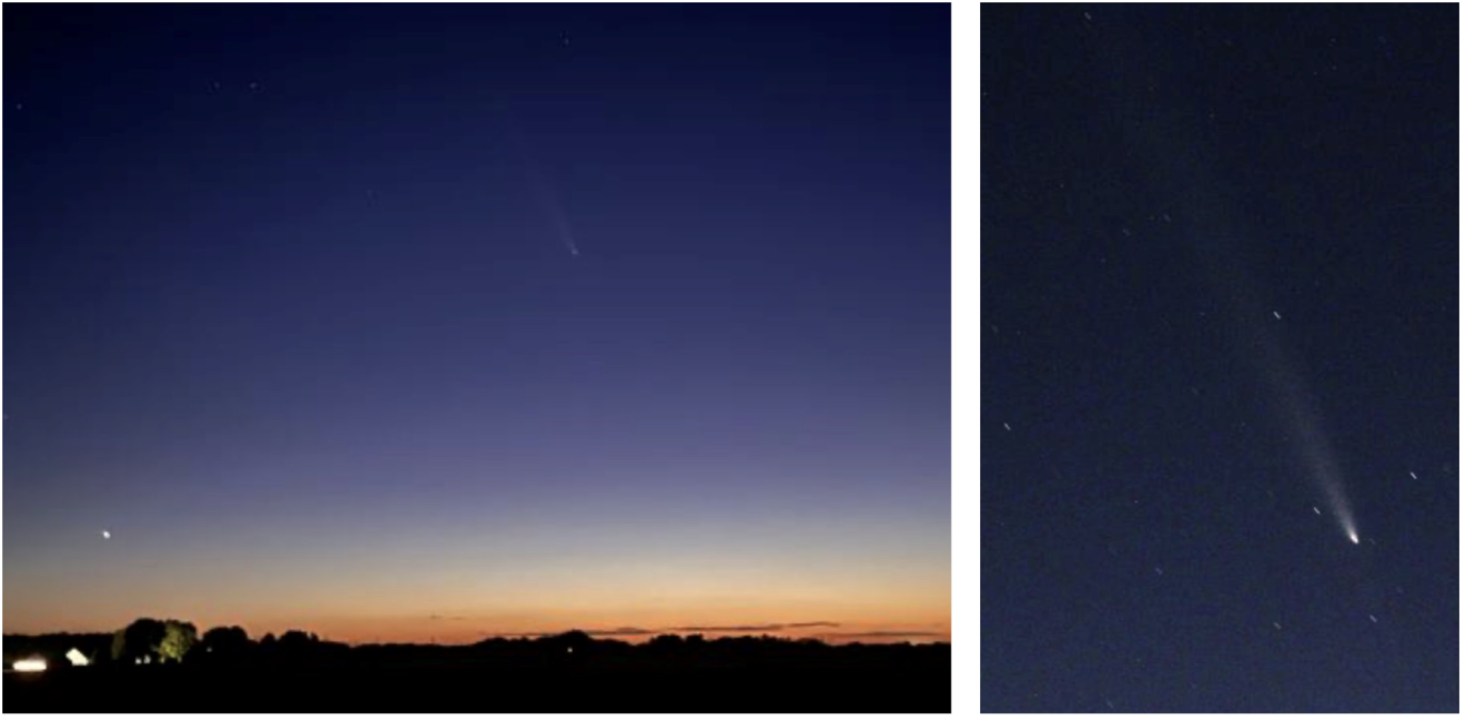Comets are astronomical phenomena with multiple chemistry connections. Comet Tsuchinshan-ATLAS was a comet recently visible to the naked eyes of many observers. At times the comet’s tail was estimated to be 18 million miles long (29 million km).11 This is nearly one-fifth of the 93 million mile (150 million km) distance from the Earth to the Sun.12 When placed in the perspective of the Community Solar System model centered in Peoria, IL, where the scaling factor is 99,000,000 to one,13 the 29 million mile tail becomes 0.29 km, or 290 m long. The planet Earth is approximately 13 cm in diameter in this model.13,14 Figure 2 shows two views of Comet Tsuchinshan-ATLAS. Possible chemistry connections can be made with the composition of the comet, which can by analyzed spectroscopically. A typical emission spectrum of a comet can be found in the literature.15 The spectrum has a curved baseline produced by reflected sunlight from dust in the comet. The spectrum also has sharp peaks corresponding to emissions from specific chemical species, e.g. hydroxyl radicals. I brought these spectral features to the attention of my Environmental Chemistry class, since we cover the backbody emission curve from the sun and we also discuss hydroxyl radicals in atmospheric chemistry.16 Similar to hunting the aurora described above, using my cell phone camera and image saturation really helped me to search for the comet even when I could not see it with my eyes.