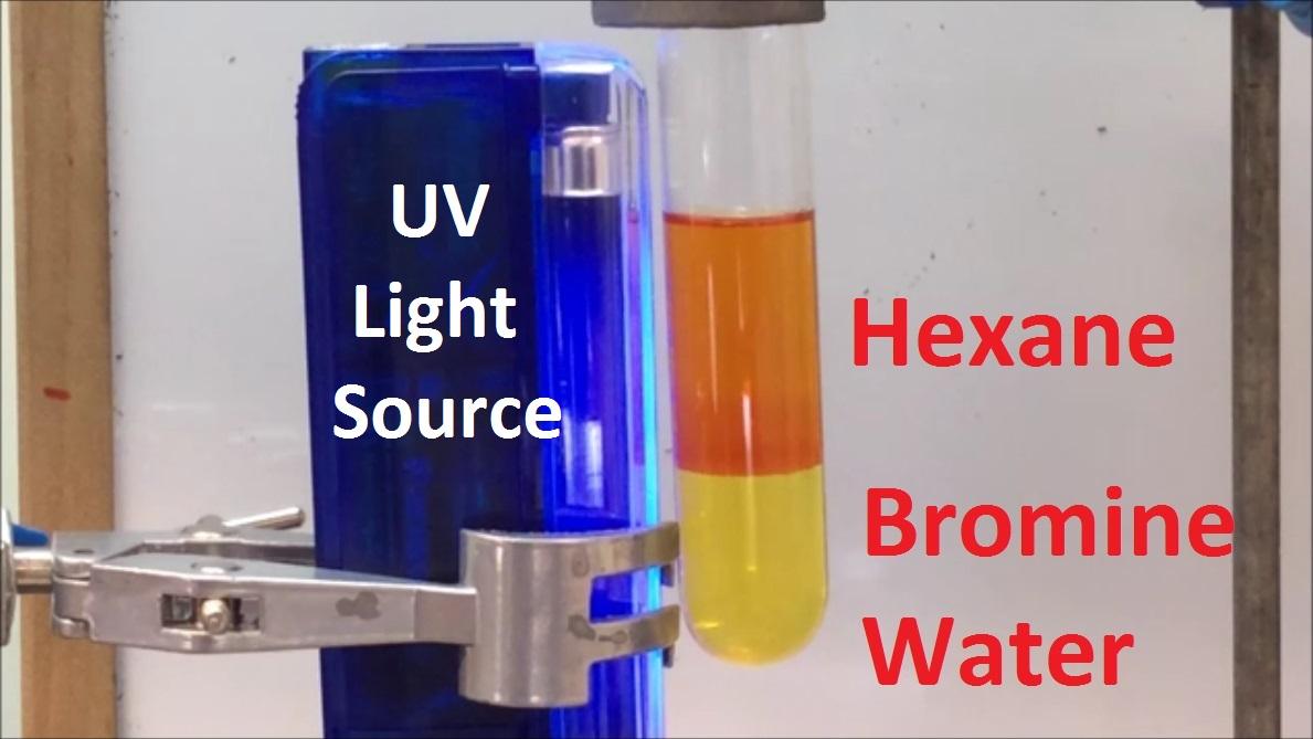 I am starting to think that I need to show my students more reactions (both in labs and as demonstrations) to help them expand their chemical understanding. I know I can't show the reaction above. But I found some hexane and bromine water in the chemical stockroom at my school so I set up a demo in class to show the bromination of hexane in the presence of UV light. (On a side-note, I showed the addition reaction of bromine water with hex-1-ene also.)