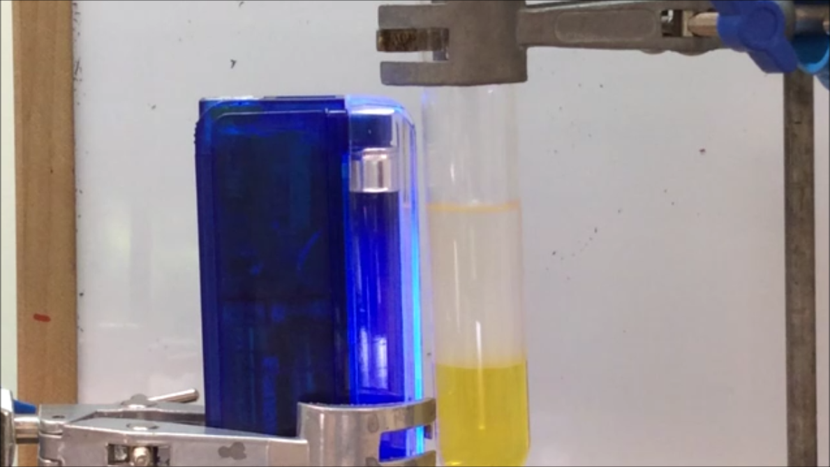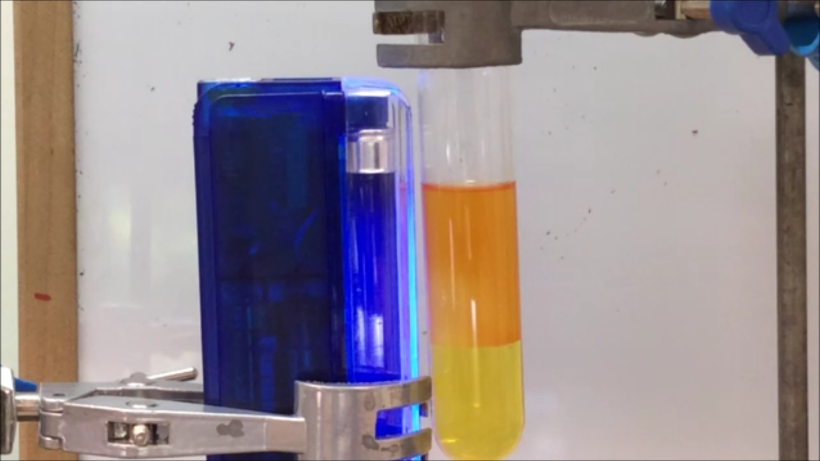 Below are a few pictures from the reaction, along with a link to the video which I've uploaded onto YouTube. While watching the reaction and the video I wondered why the yellow-ish color of the bromine water stayed, even after mixing repeatedly and leaving it in the UV light. (I noticed the same thing with hex-1-ene. It would turn the bromine water clear when I swirled the test tube. This would last for a few minutes then the bromine water would eventually turn back to a faint yellow hue.) My students also noticed that the solution gets a bit cloudy after the reaction. This provides yet another question for us to explore. And of course rate of reaction, solubility and intermolecular forces are all at play here, so that could lead to additional discussions. I'm not sure we'll have time for this mini-exploration since the school year is almost finished, but maybe next year when I cycle back through organic chemistry we can revisit this reaction and try to learn more.
