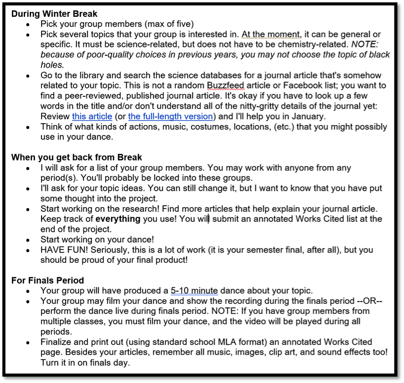 Unlike the PhD version, students do not have to do their own research or experiments. Instead, they find a published, peer-reviewed article on a science-related topic and rhumba, pop-n-lock, mechanically-robot, lyrically ballet, or otherwise rhythmically explain. Fortunately, our library and librarian (and public library system!) are amazing, and we have a lot of databases and resources. Really, my students’ problem is choosing a topic from seemingly esoteric scientific titles and abstracts. I give them very little homework during the year anyway (a topic for another day), but I consider this assignment their homework for about three weeks’ time (after Winter Break until Finals period). This final is a lot of work for students. In the past, I haven’t distributed an official schedule, but during class, I do offer periodic verbal descriptions of where I think their progress should be.