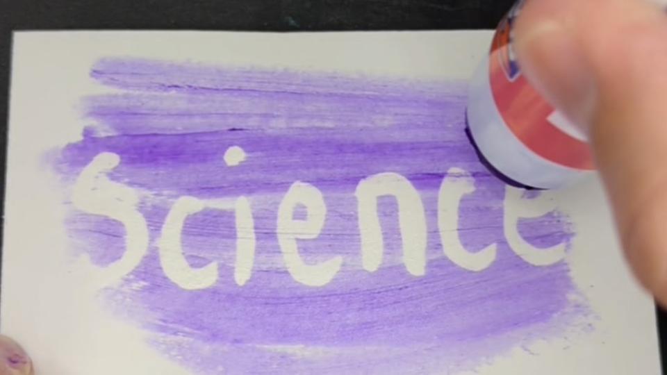In this last demonstration, Elmer’s Disappearing Purple glue stick is applied to a notecard revealing a secret message written in vinegar before the class period. The purple color in the glue stick comes from an acid-base indicator called o-Cresolphthalein which is purple at pH above 9.8 and colorless below. When the glue comes in contact with the dried vinegar, it rapidly changes colorless, surprising the students (Image 3). Since most students are familiar with the Disappearing Purple glue stick, this demonstration provides a short anchoring phenomenon to start an acid-base unit. After students are puzzled by the secret message during the demonstration, you can put them into small groups to see if they can replicate the phenomenon using various household acids and bases. Some products will intensify the purple color (base), and some remove the purple color (acid).