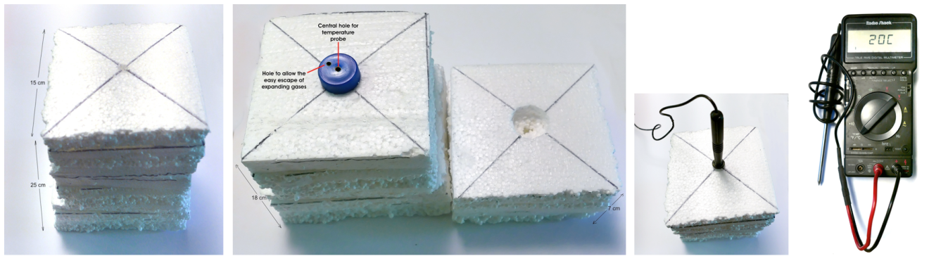 Figure 4 shows the apparatus I used: left assembled polystyrene insulated container composed of a total of 9 layer of ~2.8 cm thick 15 x15 cm polystyrene, 6 layers glued together forming the base, and 3 layers glued together to form the lid (total height ~25 cm); image second from left, polystyrene insulated container opened showing enclosed 50 mL reaction tube, and the lid with a cutout to fit the reaction tube cap, and hole for a suitable temperature sensor; image third from the left, lid housing the temperature probe; far right image, electronic temperature probe.