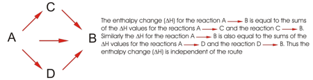 Introduction: Hess's Law states that regardless of the number of reaction steps, the total enthalpy (heat energy) change (∆H) for the overall reaction being considered, is always the same and equal to the sum of all the ∆H values for the all the individual steps. This law is a manifestation of enthalpy being a state function (like Gibbs free energy and entropy). In chemistry, a state function is a property of a system that depends only upon its current conditions, and is independent of the route by which it was created. Thus if A is converted to B the heat released (enthalpy or ∆H) would be identical if this reaction proceeded directly or via compounds C or D (see figure 1). Hess's law is essentially the chemistry equivalent of the law of the conservation of energy in physics, which states that the total energy of an isolated system remains constant.