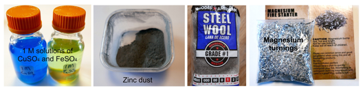 Fine iron or steel wool is the preferred source of iron, zinc dust is the preferred source of zinc, and magnesium turnings (used for camp fire starting, and sold at camping stores etc.) are the preferred source of magnesium (figure 2).