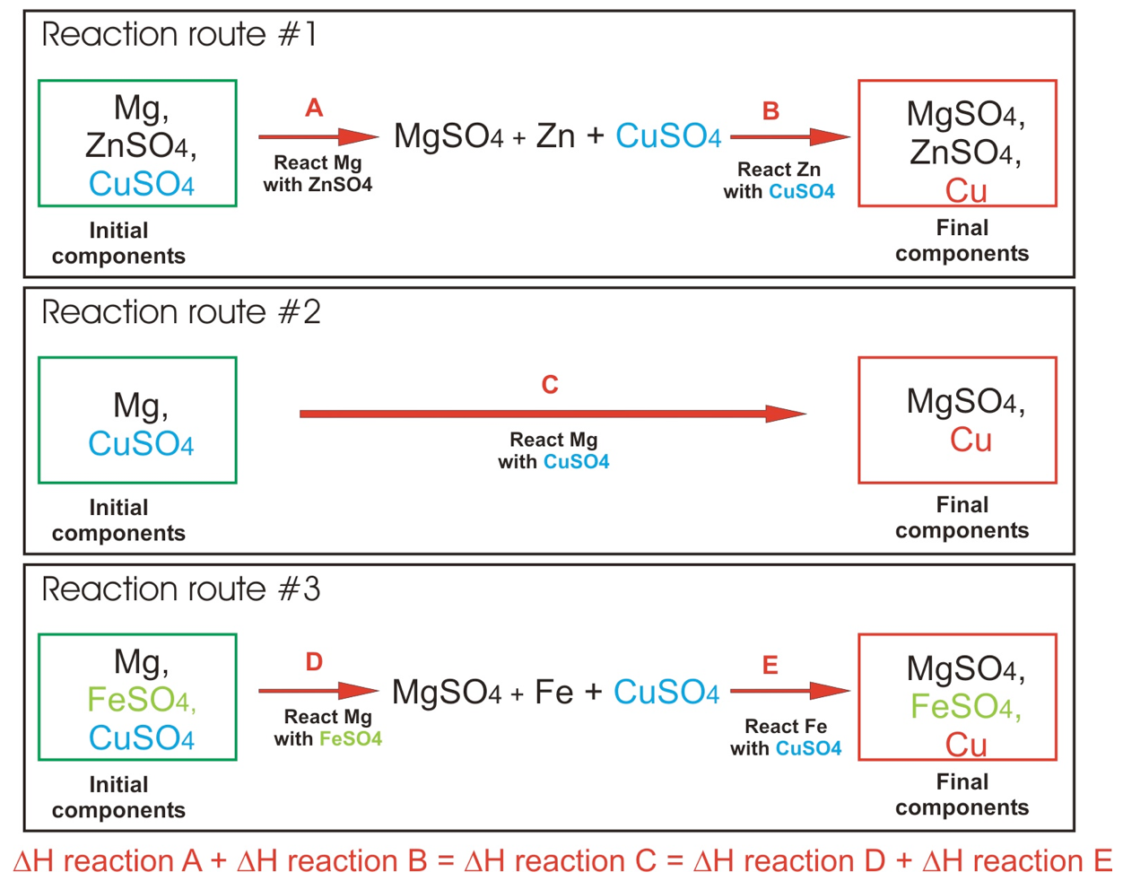 The reactions involving Mg metal were the most exothermic, particularly the Mg/copper(II) sulfate reaction, because of this 0.5 M solutions of the various salts were utilized to eliminate the risk of boil over when using Mg. It is best to seal the magnesium turnings in a small homemade paper 'teabag' to cause a short delay in the start of the reaction. This gives sufficient time to seal the tube and mix the reagents. To demonstrate Hess's law only two routes from the initial to the final state are required, however in the demonstration described 3 routes (A+B, C, and D+E) are used (see figure 3).