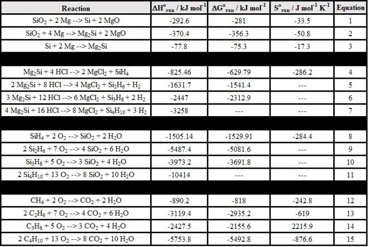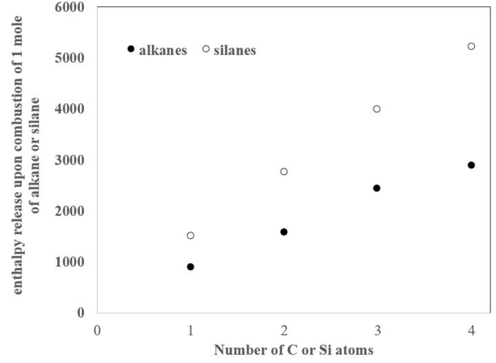 It is interesting to compare the enthalpies of combustion (Figure 1) of each silane (Equations 8-11) to the enthalpy of combustion of its corresponding alkane (Equations 12-15):