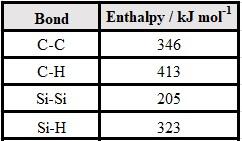 These ideas can be expanded upon further by comparing the average bond enthalpies of various chemical bonds that contain carbon and silicon (Table 2). Notice that on average it requires 141 kJ mol-1 more energy to break the carbon-carbon bond as compared to the silicon-silicon single bond. Similarly, it takes an average of 90 kJ mol-1 more energy to break the carbon-hydrogen bond as compared to the silicon-hydrogen bond. The alkanes are thus more resistant to chemical bond breaking – and therefore more resistant to chemical change – than the silanes. Further discussion on the stability of carbon-chained molecules vs. silicon-chained molecules may be found in reference 8.