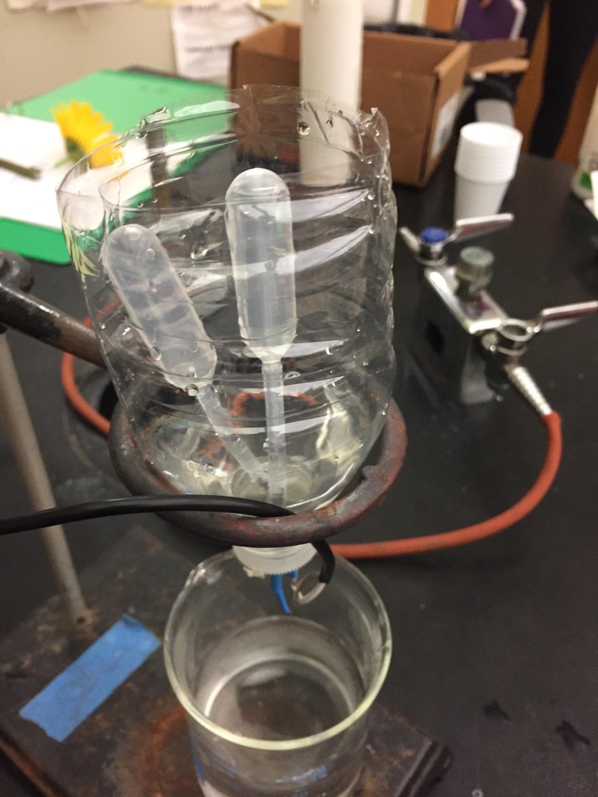 Next, I wanted to have the students work with a Hoffman apparatus. There are many places online to build a DIY Hoffman apparatus. The ACS offers an electrolysis of water lesson that includes a hand made Hoffman apparatus as part of a unit on energy that I used as a resource. For a power source I stopped by our local internet provider. They often get in old broken modems and throw them away. They are more than happy to provide me with the 9 volt power source. This saves me from having to use 9 volt batteries that get expensive. Next, I stopped by the local hobby shop to explore the remote control plane section. They sell these very thin and strong graphite/carbon rods used in building the wings of these planes. Cutting these up into 1 inch pieces makes nice electrodes that do not react with anything over time. I then strip some of the insulation off of the wires and purchase some heat shrink wrap at the same hobby store. I simply twist the bare wire on the carbon electrode add the shrink wrap with a little heat from a hair dryer and the wires are now connected to the electrodes. Next, it is time to "dumpster dive" into my recyclying bin at school and get some water bottles. I cut them in half. I then take a hot nail and poke a hole in the lid to fit the electrodes and add hot glue to helps stop leaks. The lid is screwed on and then carefully placed in a ring stand. The other half is used as a cheap beaker. Students are provided with .1 M sodium sulfate solution, told to pour it in the inverted top with the electrodes and plug it in.