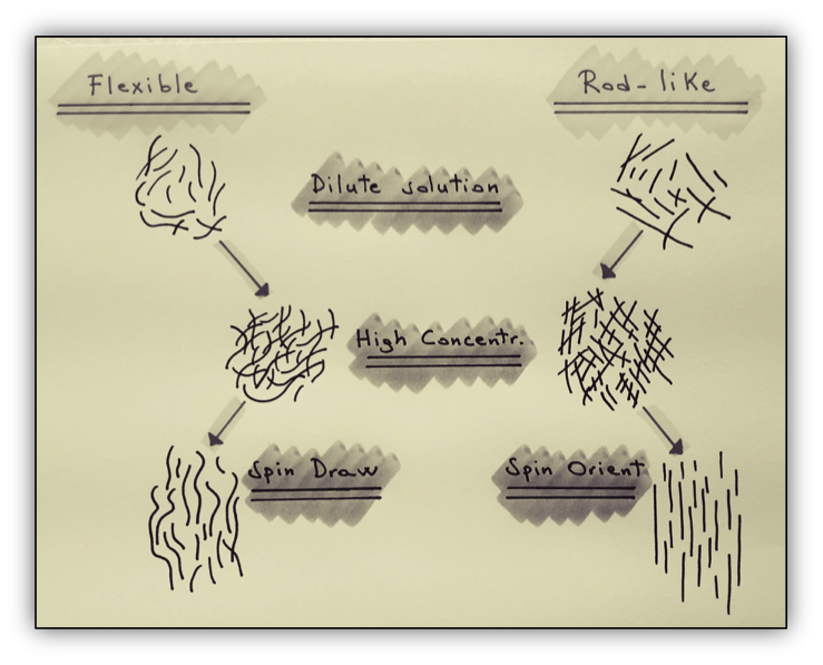 Figure 2 - Behaviour of flexible and rod-like macromolecules during spinning process.