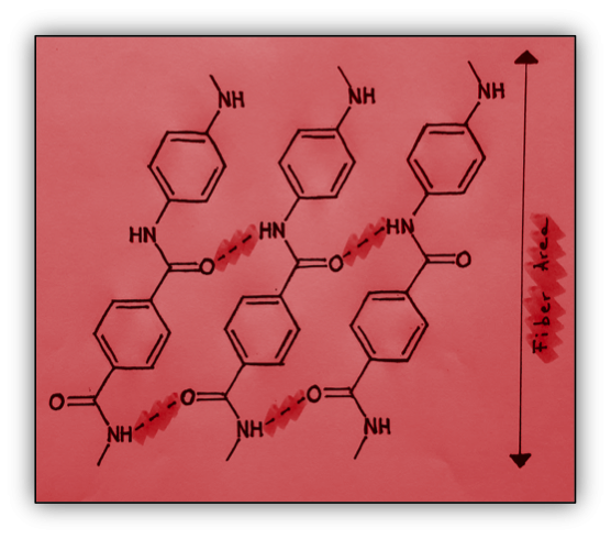 Since Kevlar feature high drawability, all its fibers have high tenacity and high tensile modulus along with a high heat resistance. All these properties are actually consequences of its molecular structure. In fact, due to the para-orientation of the aromatic rings, the chains form planar sheet systems which are actually locked together via hydrogen-bonds (see Figure 3). Additional strength is given by the interaction of aromatic rings which tend to be stacked up.