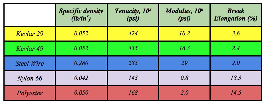 Table 1 - Mechanical properties of different commercial versions of Kevlar and other materials.5