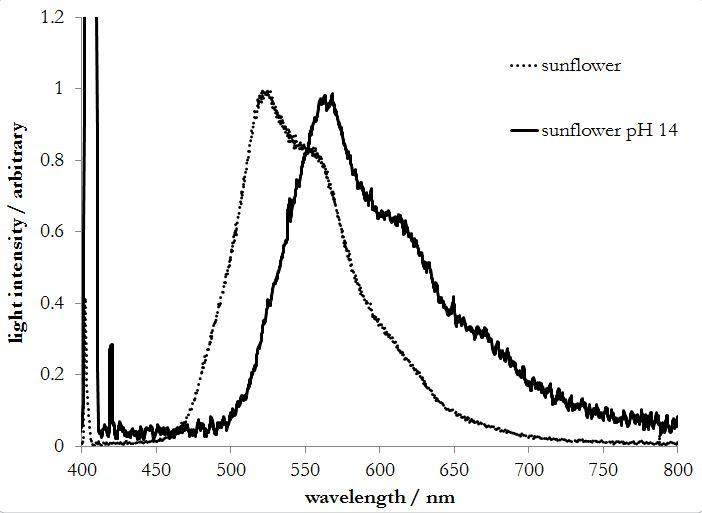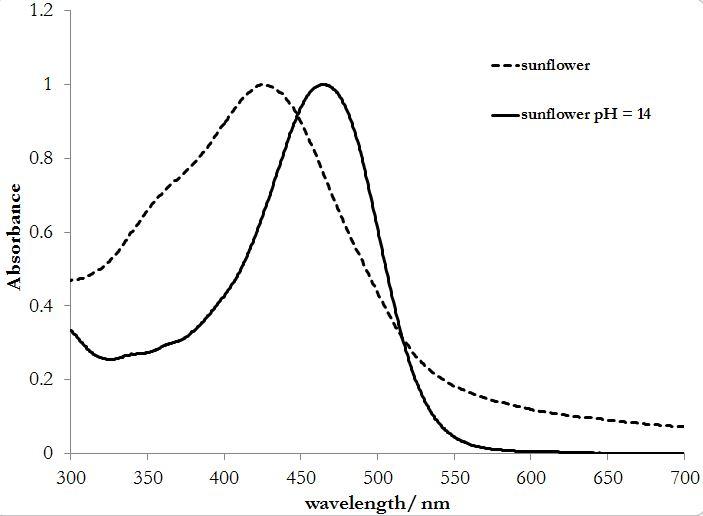 After addition of base to a solution of the Sunflower dye (acetone as solvent), the resulting solution was observed to fluoresce orange upon illumination with UV/violet light. You can see this experiment at the end of the video posted above. This test suggests that the compound bixin is contained in the Sunflower dye. The orange fluorescence observed at high pH is consistent with the formation of norbixin, even though I am not completely convinced this is what is going on.