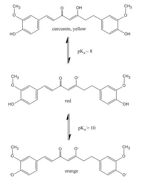 Turmeric is known to contain curcumin (Figure 1), a bright yellow compound. Curcumin is an acid-base indicator.1,2 At or below pH 8 curcumin is fairly non-polar so it does not dissolve well in water (Figure 1, upper structure). Around this pH curcumin also has a yellow color, and emits yellow-green fluorescence. Above pH 8 curcumin loses a proton and gains a negative charge, allowing the resulting ion to dissolve well in water due to ion-dipole attraction (Figure 1, middle structure). This change also causes a loss of fluorescence and a color change to orange-red.1 At even higher pH, the phenolic protons are lost, 1,2 which causes curcumin to be even more negatively charged (Figure 1, bottom structure). The loss of protons causes yet another color change.