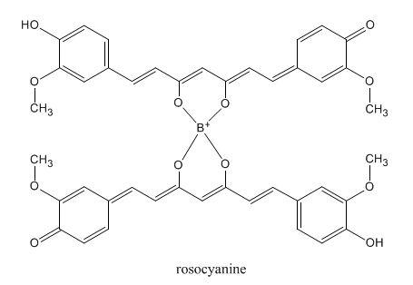 Interestingly, curcumin binds to borates to form rosocyanine, a red colored complex (Figure 2).3 The rose-red color of this complex allows for a sensitive test for the presence of borates through addition of solutions of curcumin.