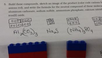 I used JCE Classroom Activity #111 in my chemistry classes today. (Subscription to JCE required.) What a great way to help students make the connection between number of ions present, the charges of the ions and the neutral compound formula. It is easy for the teacher to spot misconceptions and address them as you move around the room and watch students complete the activity. Be careful to make sure the students are really building. I tried to make sure to see each student build at least one compound. I brought the class together for a final discussion of the activity before they completed the questions at the end of the activity and chose students to build compounds that I wrote on the board. You could use the lego sets, but I used the LEGO Digital Designer software suggested in the lab. I didn't have my students use it for the main activity, but it would certainly be an option if your students have internet access in your class or if you wanted to send this activity home as homework.