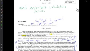 I've attached a student lab report that has my feedback if you are interested. (Note: I've removed the student's name to keep it anonymous, but I did receive the student's permission before using this work.) For context, the lab involved calculating the molar mass of butane. When marking this lab, I focused on the Evaluation section - which in the IB world includes the conclusion and evaluation. However, as you can see, I gave feedback throughout the lab.