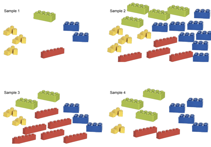 - I utilized four different colored LEGO pieces, varying the quantity of each to simulate the reactants in a chemical reaction. Each student group received a total of eight LEGO pieces: four 1x1 yellow pieces, two 3x2 blue pieces, one 6x1 red piece, and one 4x2 green piece.