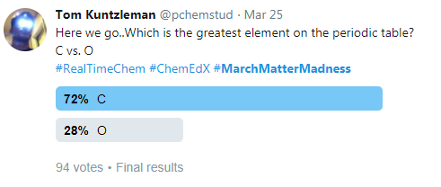 This past March, I ran a multi-day poll on Twitter that was designed to be a fun way to determine the “best” element on the periodic table. I’m sharing about the poll here on ChemEdX in case others might want to try something similar in their classrooms.