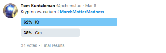 The poll was run tournament-style, fashioned after NCAA Basketball’s March Madness. The event was called #MarchMatterMadness. Just like basketball’s March Madness tournament, four different “regions” were set up, and each element was seeded into brackets according to atomic number. Accordingly, hydrogen, helium, lithium, and beryllium were all #1 seeds in the four different regions; boron, carbon, nitrogen, and oxygen were all #2 seeds in the four different regions. This process was continued until all 118 elements were seeded and placed into the brackets (ten elements received first round byes). A simple Twitter poll was conducted to determine which element advanced to the next round. For example, in the first round krypton defeated curium by earning 62% of the poll votes compared to only 38% for curium: